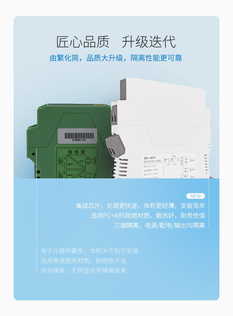 產品描述:信號隔離器是一種信號隔離裝置,將輸入單路或雙路電流或電壓信號,變送輸出隔離的單路或雙路線性的電流或電壓信號,并提高輸入、輸出、電源之間的電氣隔離性能。