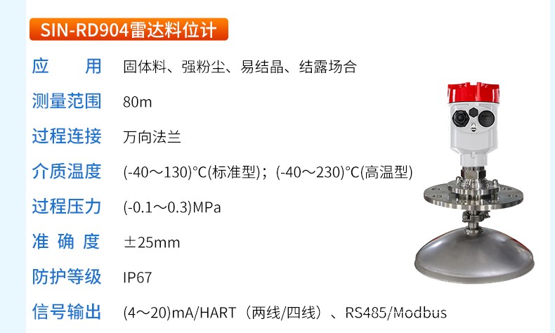 產品名稱:聯測_SIN-RD904雷達料位計_適用于強粉塵、易結晶 _