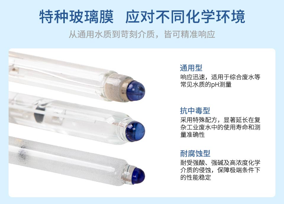 產品描述:pH 玻璃電極是由玻璃指示電極和銀/氯化銀參比電極組合在一起的復合電極,作為 pH 值測量傳感器廣泛應用于測量水溶液中的 pH 值。使用場景:自來水、地表水、含鎳廢水、含鉻廢水等。