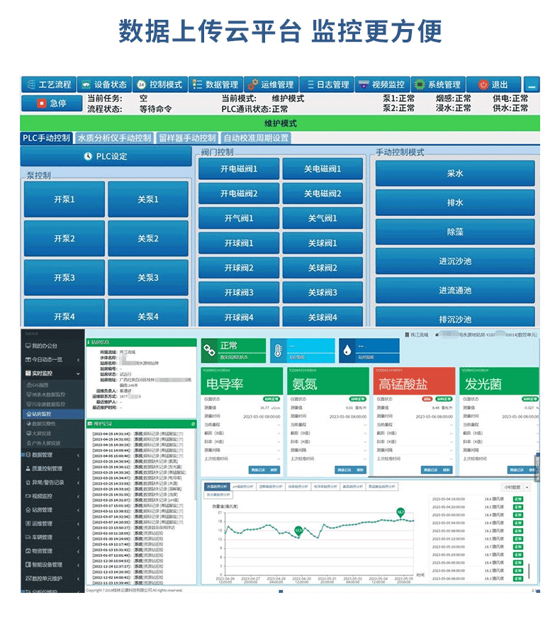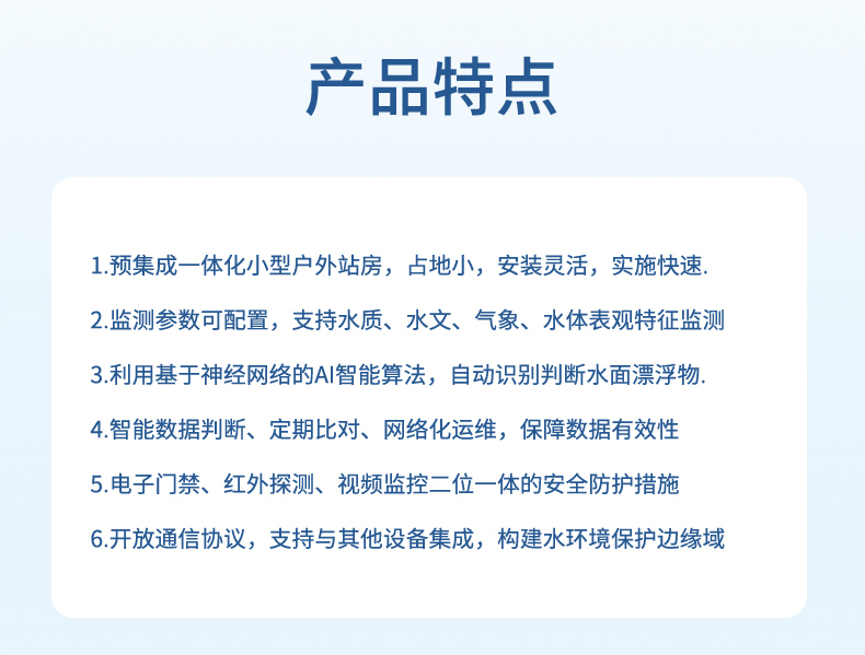產品描述:為便捷監測水環境,iWater X-MiniStation小型水站采用預集成一體化微型戶外機柜設計,包括采水系統、預處理配水系統、分析儀器系統、輔助系統、安防系統、控制與數據服務系統、Al智能分析系統、集成機柜等,具有0.5平方米、1平方米、2平方米等規格,可實現水質、水文、氣象等參數的自動測量,以及水面漂浮物的識別,并進行結構化、非結構化數據的管理與服務。依據流域河網水系特點,在河道采用iWater X-MiniStation系列微型水站進行網格化布點監控,結合信息化技術,以大數據支撐水環境評價與預警、