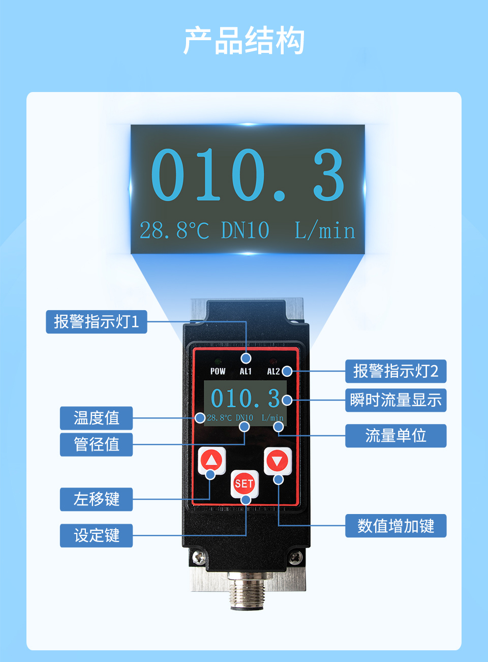 產(chǎn)品描述:微型渦輪流量計(jì)結(jié)構(gòu)簡單、精確度高、安裝維修使用方便,可對(duì)管道中的液體流量及溫度情況進(jìn)行實(shí)時(shí)監(jiān)控,支持流量和溫度(4~20)mA 信號(hào)或 485 通信、報(bào)警開關(guān)輸出,并采用 OLED 實(shí)時(shí)顯示流體流量及溫度,實(shí)現(xiàn)管道當(dāng)中流量溫度一體式的監(jiān)控功能。本產(chǎn)品廣泛應(yīng)用于石油化工、電力、治金、鋼廠、造紙、食品加工、水處理、電池廠等行業(yè)。