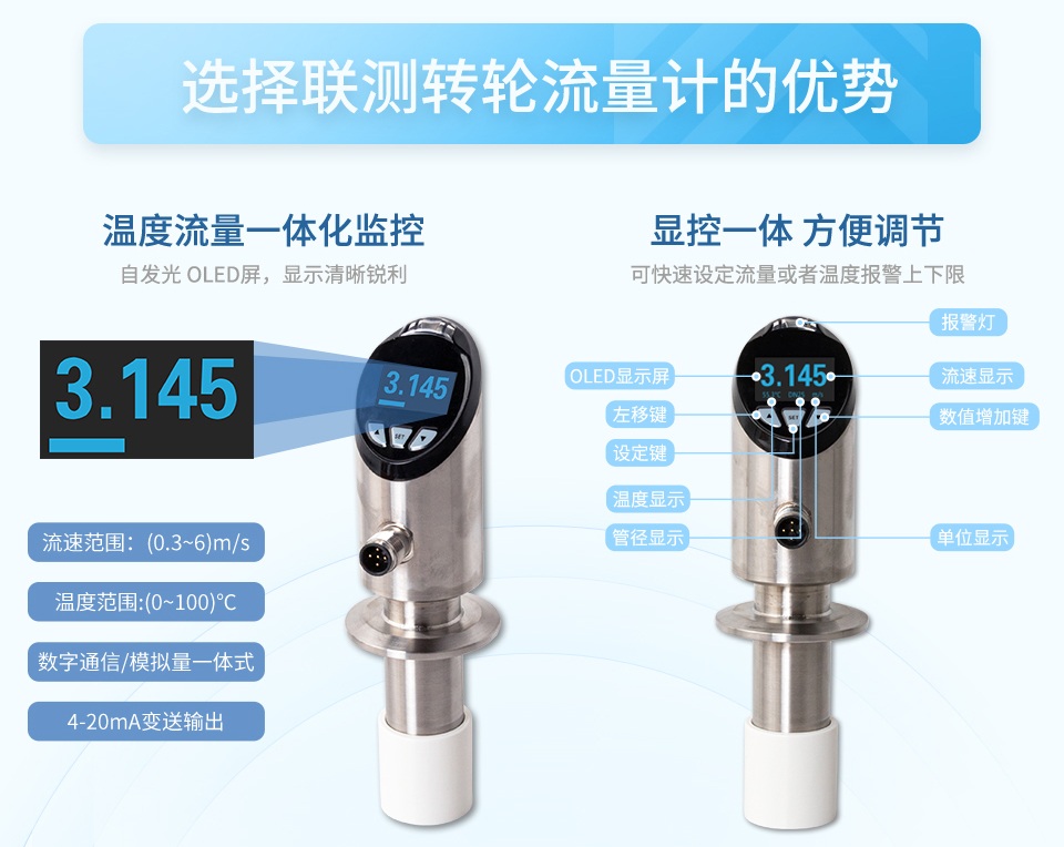 產品描述:轉輪流量計結構簡單、穩定性高、安裝維修使用方便等特點,可對管道中的液體流動及溫度情況進行實時監控,提供流量及溫度的信號輸出,流量及溫度報警開關輸出,并采用 OLED 顯示屏實時顯示流體流速及溫度,實現管道當中溫度流量一體式的監控。被廣泛應用于半導體、光伏、石油化工、電力、治金、鋼廠、造紙、食口品加工、水處理、電池廠等行業。