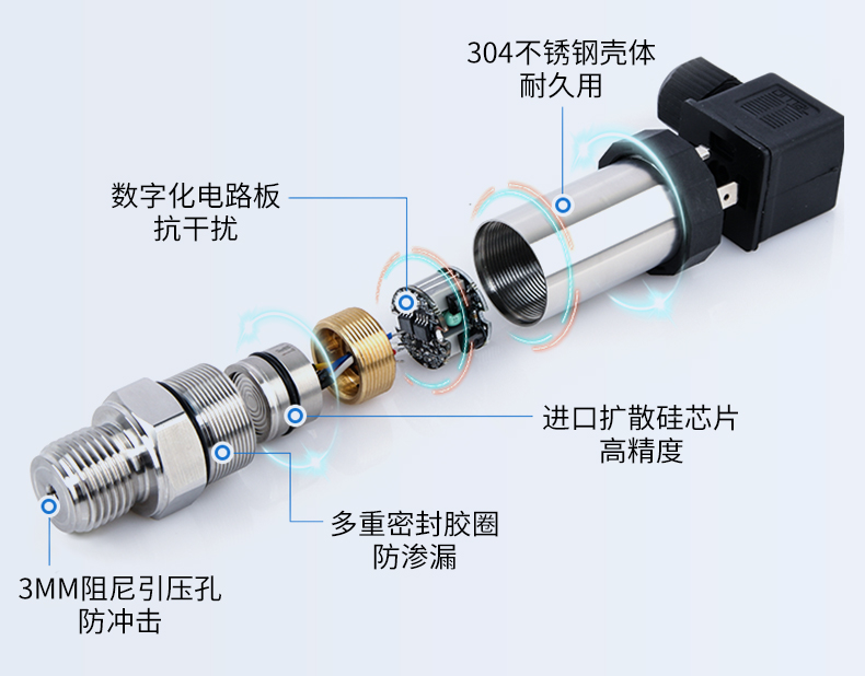產(chǎn)品描述:擴散硅壓力變送器選用進口高精度、高穩(wěn)定性壓力 敏感芯片。敏感芯片采用先進的微機械刻蝕加工工藝, 通過在硅片上擴散四個高精度電阻,從而形成惠斯通電 橋。由于壓阻效應,四個橋臂電阻的阻值發(fā)生變化,電 橋失衡,敏感元件輸出一個對應壓力變化的電信號。輸 出的電信號通過放大和非線性矯正電路的補償,產(chǎn)生與 輸入壓力成線性對應關系的電壓、電流信號。