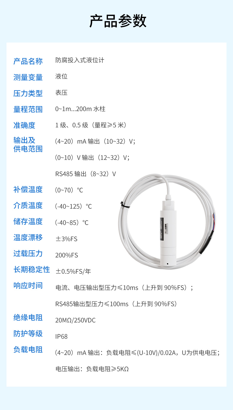 產(chǎn)品描述:防腐投入式液位變送器由高性能陶瓷壓力傳感器作為測量元件,把與液位深度成正比的液體靜壓力準(zhǔn)確的測量出來,并經(jīng)過信號調(diào)理電路轉(zhuǎn)換成標(biāo)準(zhǔn)的電流、電壓或 RS485 信號輸出,建立起輸出信號與液位深度的線性對應(yīng)關(guān)系,實現(xiàn)對液體深度的測量。產(chǎn)品采用聚四氟乙烯防腐材質(zhì),具有優(yōu)良的耐腐蝕性能,廣泛適用于化工廠酸、堿性等腐蝕介質(zhì)的液位測量。