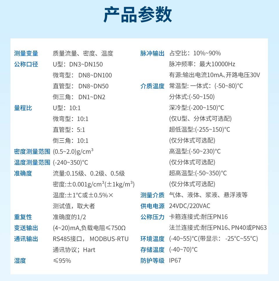 產品描述:科里奧利質量流量計是根據科里奧利力原理開發的一種新型的流量測量儀表,可直接測量封閉管道內流體的質量流量、介質的密度和溫度。可廣泛應用于化工、石油、食品、制藥、造紙等行業。